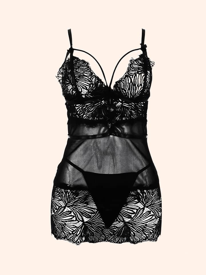 Hay noches que piden algo especial, y Lila lo tiene todo. El encaje floral y la malla semitransparente abrazan tu cuerpo con suavidad, resaltando tu figura con elegancia. El escote en V con tiras cruzadas y la espalda descubierta aportan ese toque sensual y atrevido que no pasa desapercibido. Los tirantes ajustables te dan la comodidad perfecta, mientras que el borde de encaje da un acabado delicado y femenino. El tanga a juego completa el conjunto, haciendo que te sientas segura y espectacular en todo momento.